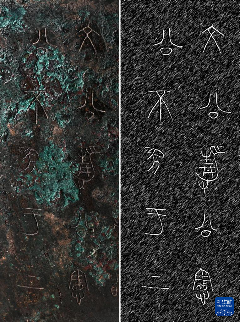 拼版照片,左图:秦公镈(一号镈)铭文中“文公 静公 宪公 不㒸(坠)于上”的刻铭特写(2024年1月23日摄);右图:左图刻铭的复原图。