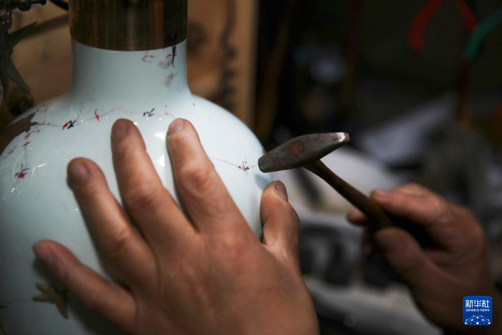 杨涛将锔钉钉入破损的瓷器(5月8日摄)。