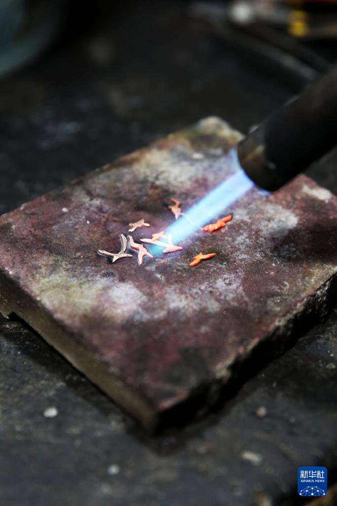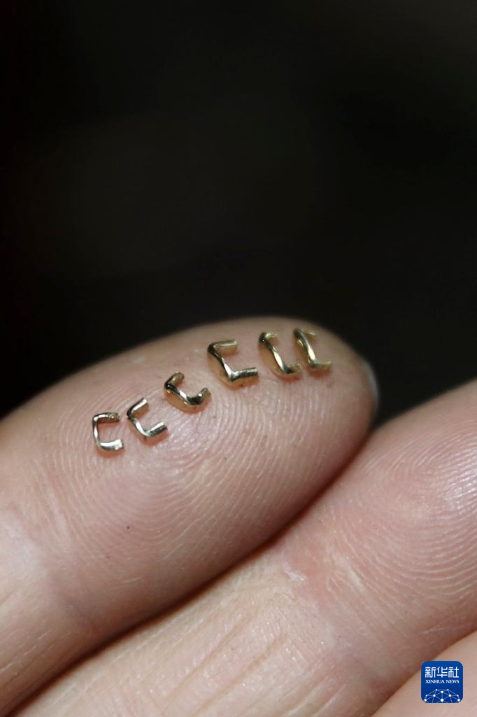 杨涛展示手工制作的金属锔钉(5月8日摄)。