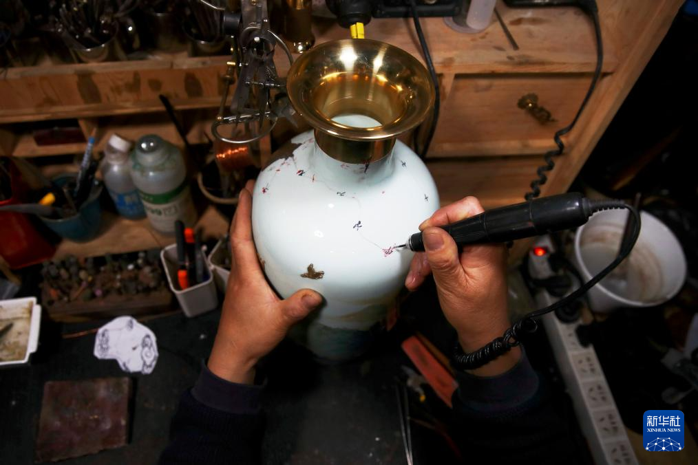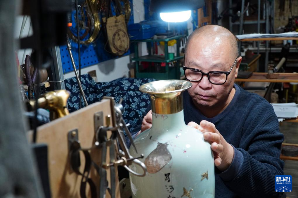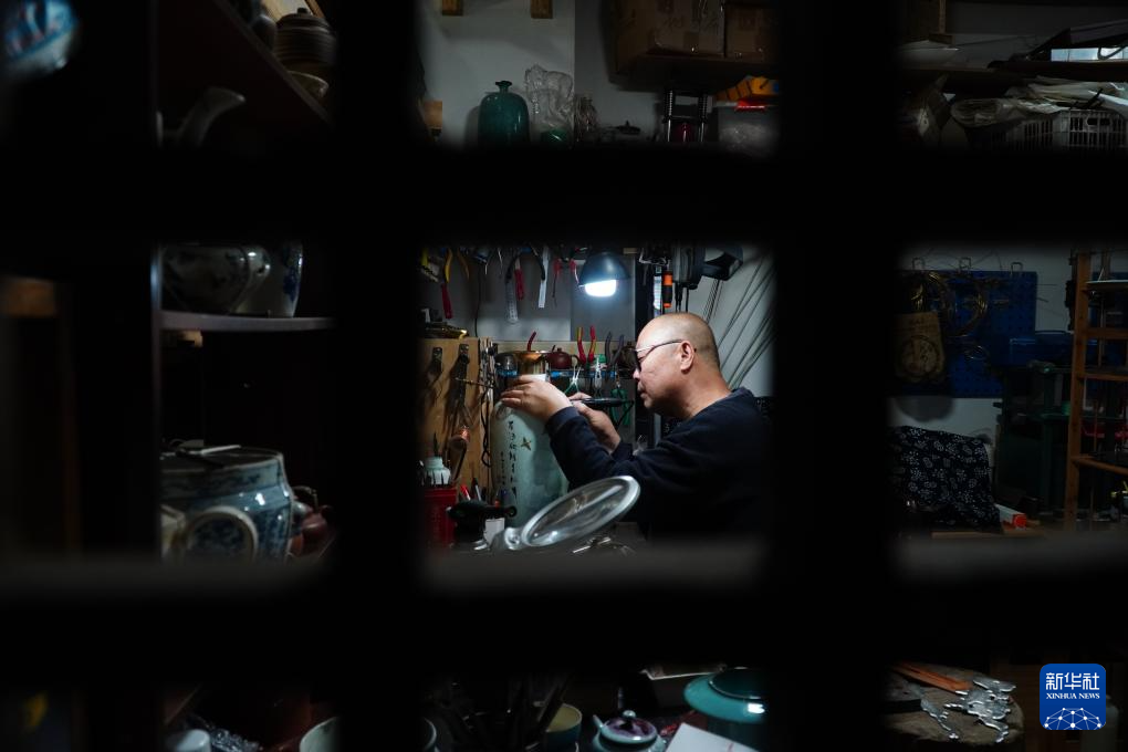 杨涛在工作室用锔瓷技艺修复破损的瓷器(5月8日摄)。