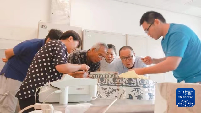杨涛(右二)在首都博物馆参加明嘉靖青花鱼藻纹残损大缸修复工作(2018年摄,受访者供图)。