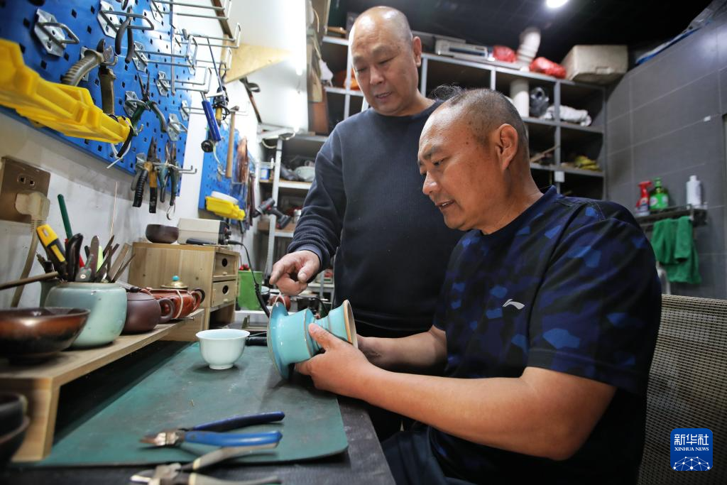 杨涛给徒弟李锋指导锔瓷的技巧(5月8日摄)。