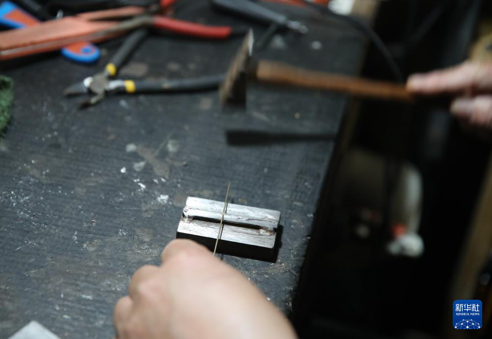 杨涛在工作室制作锔瓷用的花钉(5月8日摄)。