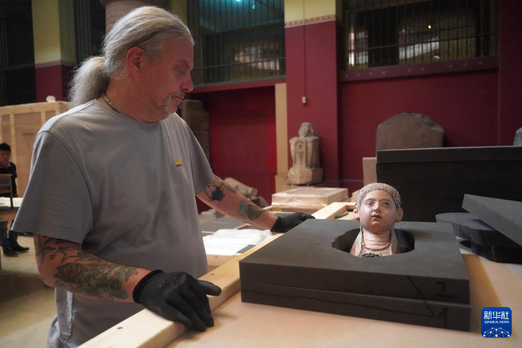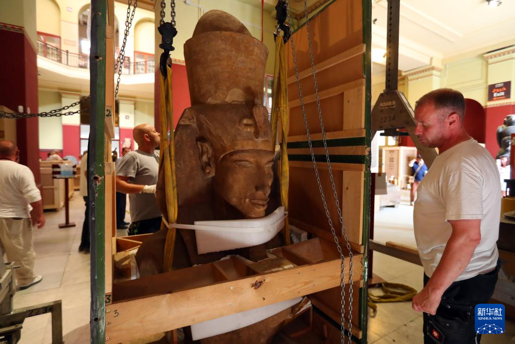 5月27日,在位于埃及首都开罗的埃及国家博物馆,工作人员对古埃及18王朝法老埃赫那吞半身像进行吊装。