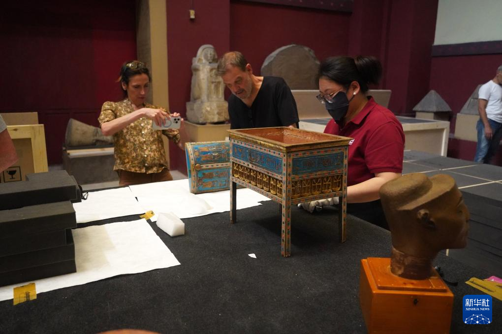 5月23日,在位于埃及首都开罗的埃及国家博物馆,工作人员对打包文物进行检查。