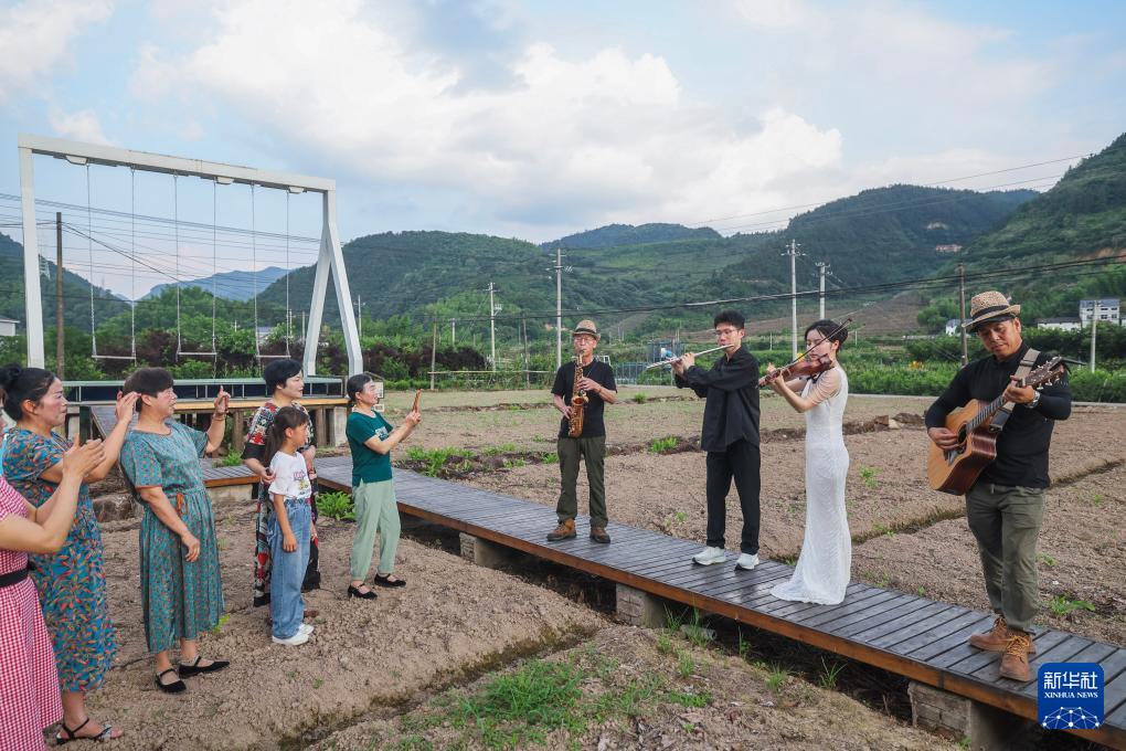 6月15日,三都镇镇头村的村民乐队乐手和杭州师范大学音乐学院的学生(右二、右三)在田间为村民即兴演出。