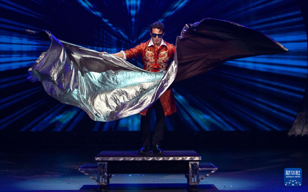 6月18日,在第十二届中国杂技金菊奖全国魔术·滑稽比赛开幕式上,欢乐谷艺术团演员艾合买提表演魔术《炫动时刻》。