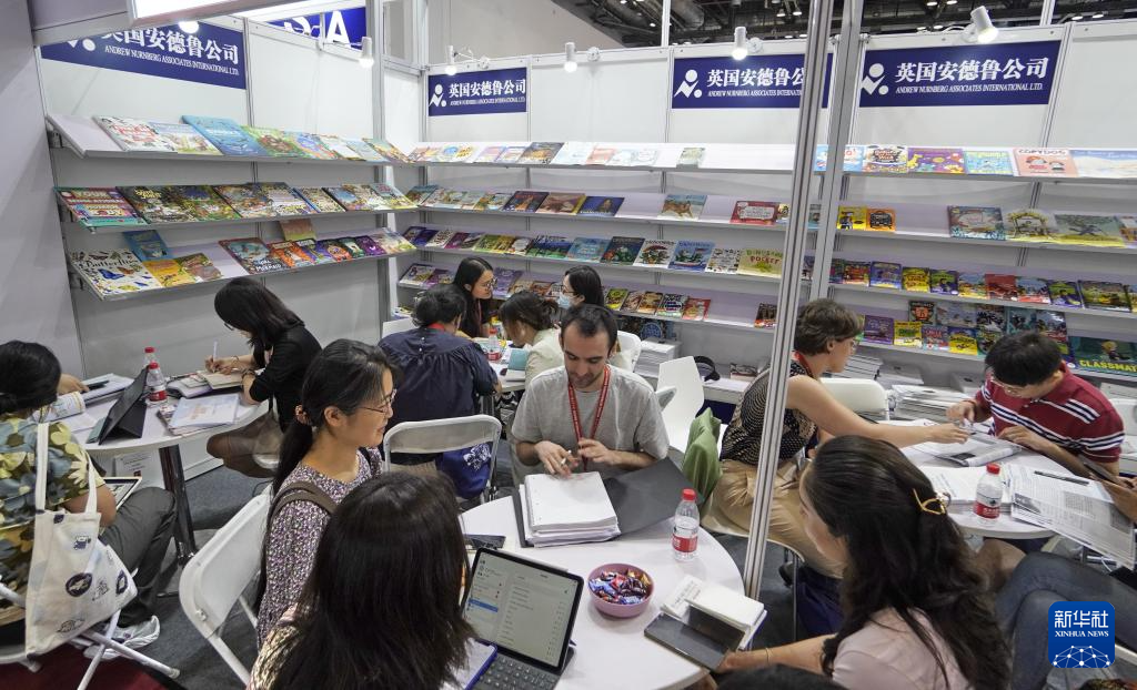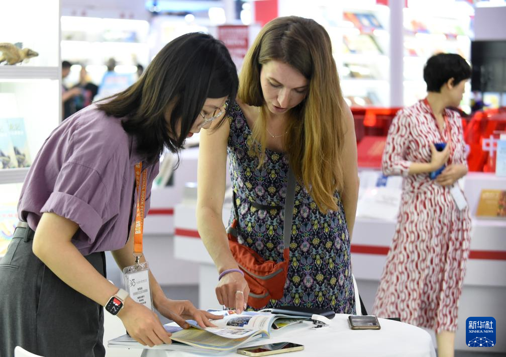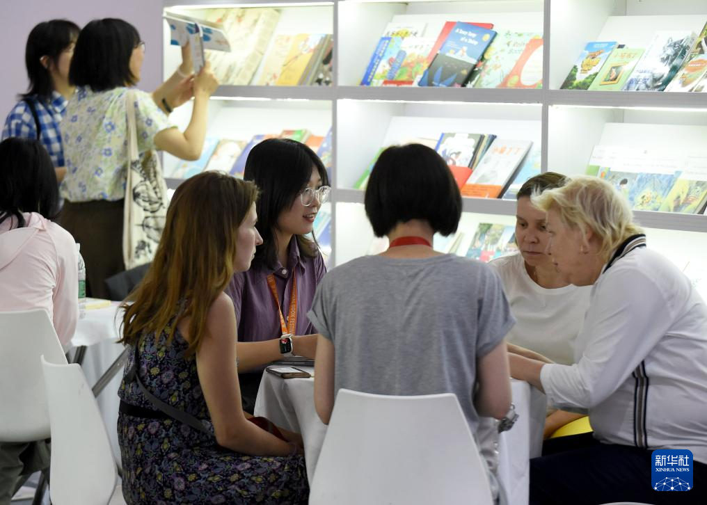 6月19日,中外出版商在博览会上洽谈业务。