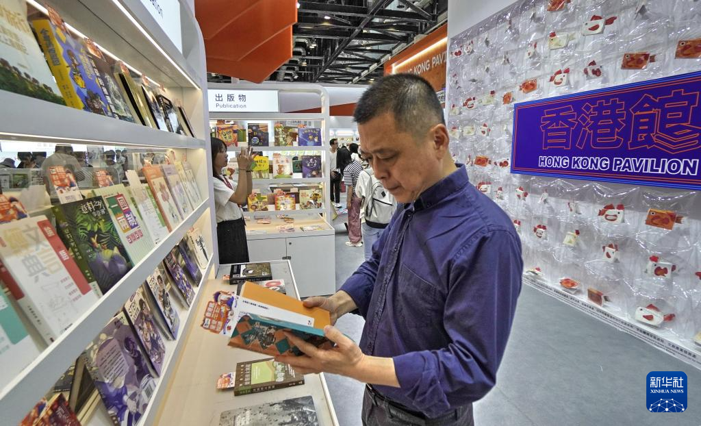 6月19日,参观者在翻阅香港联合出版集团展位的图书。