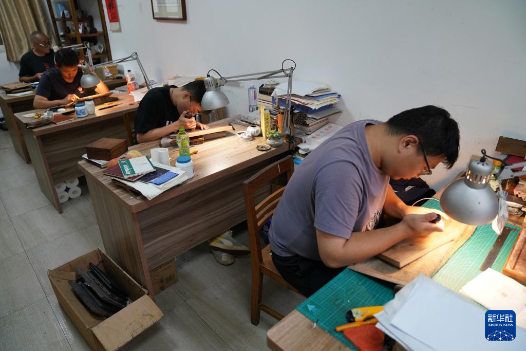 6月27日,在金陵刻经处技艺展示区,非遗传承人王康在刻版。
