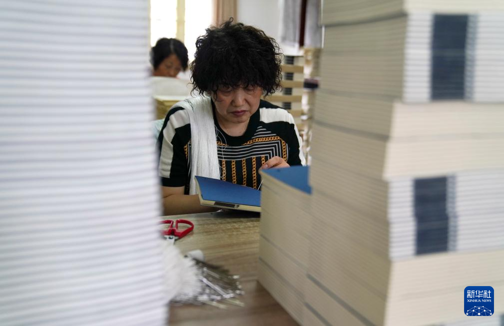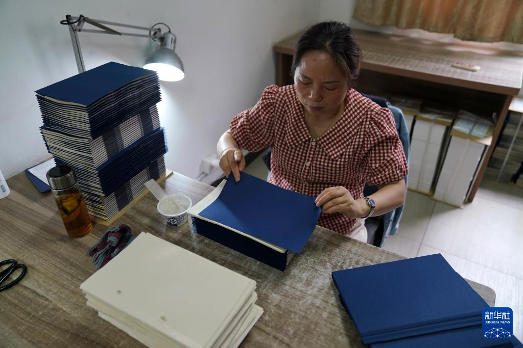 6月27日,在金陵刻经处技艺展示区,工作人员在手工装订图书。