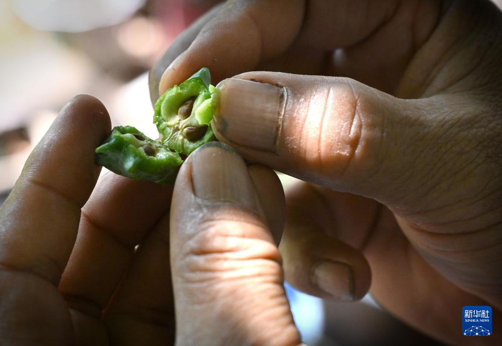 张书芳在查看制香原材料柏子仁的品质(7月3日摄)。