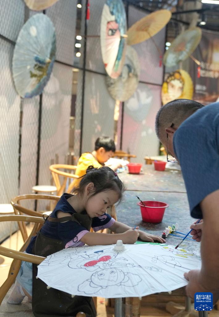 8月15日,一名小朋友和大人一起在杭州手工艺活态馆内体验伞面绘画。