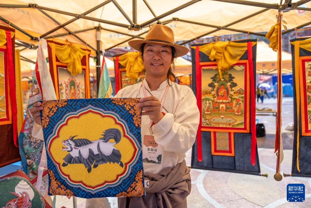自治区级非物质文化遗产传承人洛次成在展示他的作品(8月20日摄)。
