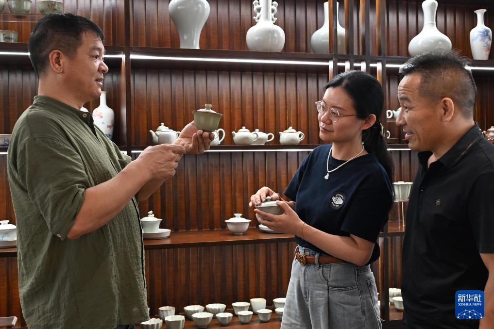 在位于江西省景德镇市善窑厂的工作室里,李善明在通过直播介绍自己的汝瓷产品(8月28日摄)。