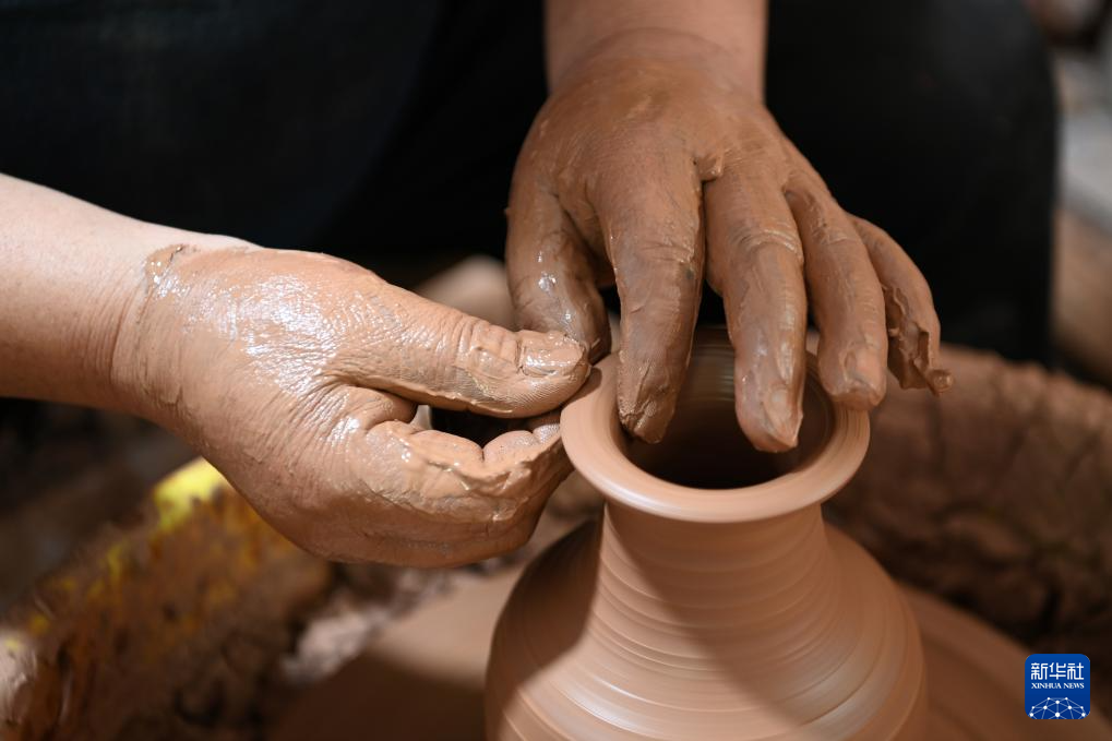 一把黄泥,一双巧手,在匀速转动的旋转盘带动下,不一会功夫,一件彩陶的泥胎就成形了。看似简单的操作,阎建林已孜孜不辍做了36载。