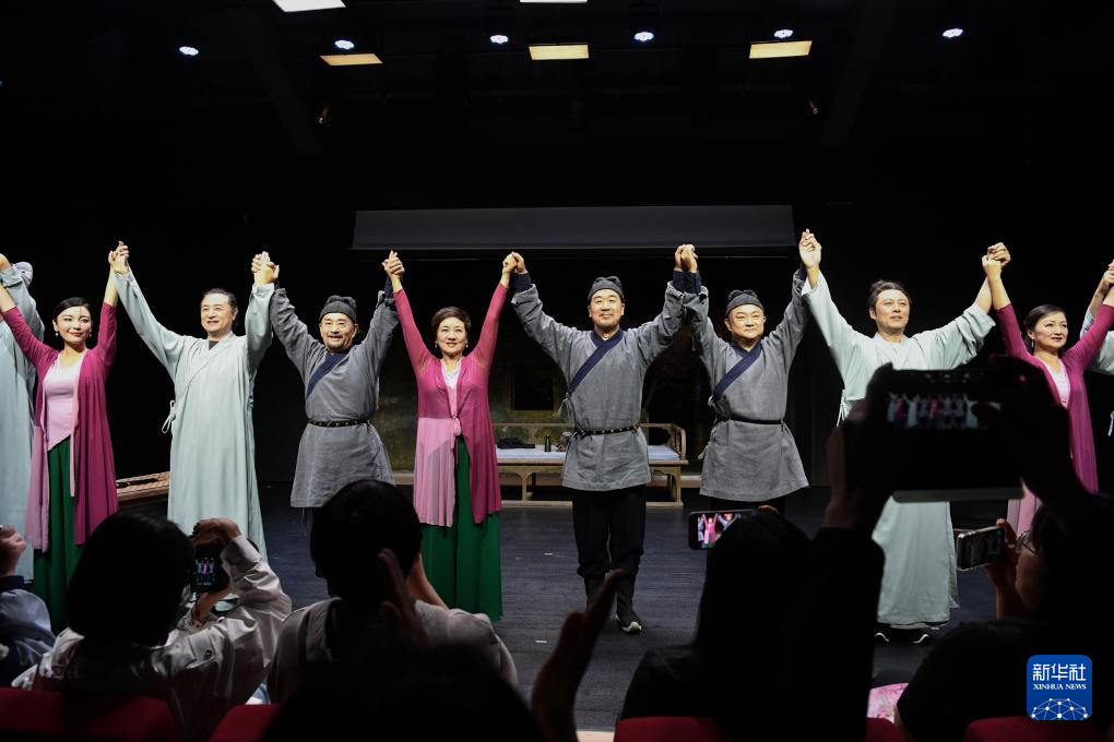 11月9日,在长守戏剧谷,张国立(中)等演员在话剧《我爱桃花》演出结束后谢幕。