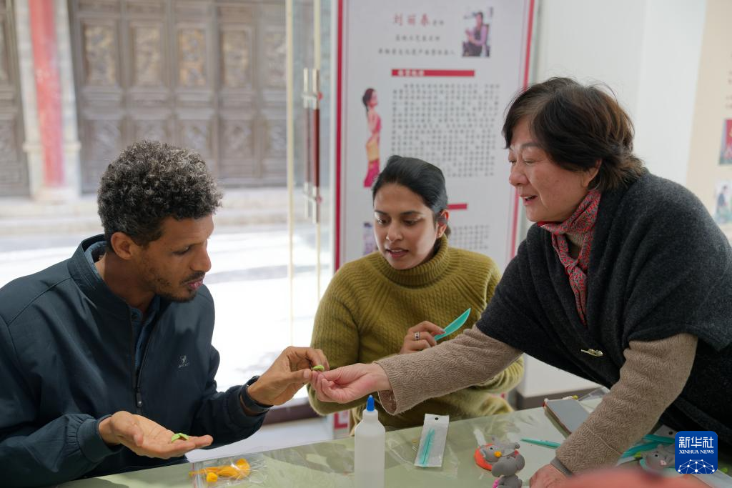 12月8日,在官渡古镇,非遗面塑传承人刘丽春(右一)指导外国游客制作面塑。