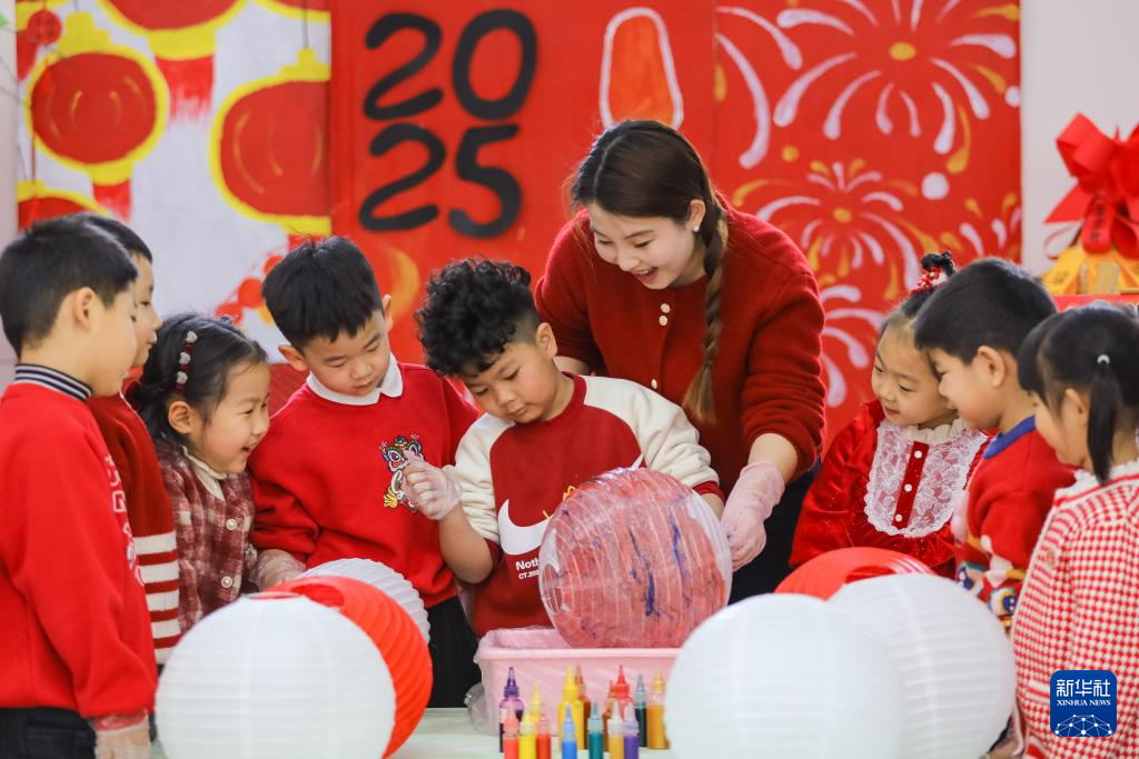 1月22日,在山东省青岛市李沧区世园幼儿园迎新春主题活动中,老师指导小朋友体验创作漂漆灯笼。