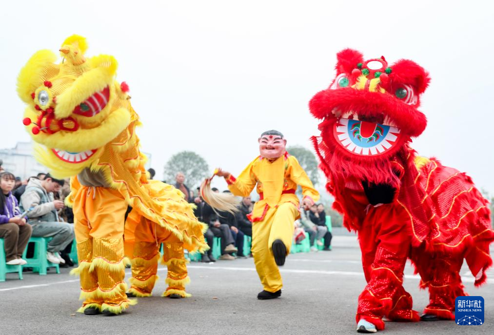1月21日,民间艺人在四川省广安市高兴镇花庙嘴村为乡亲们表演舞狮。
