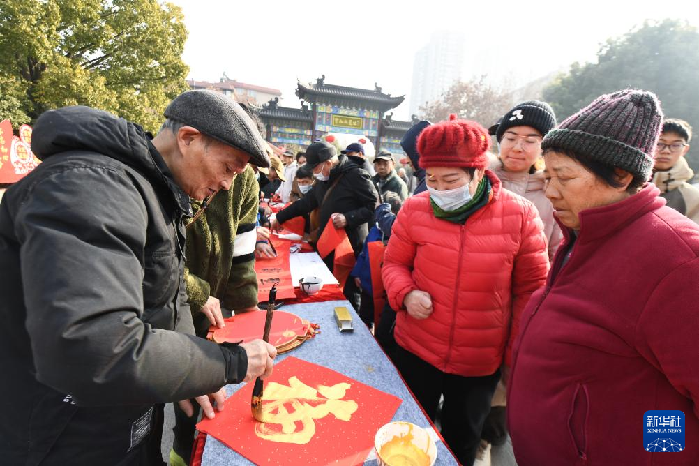 1月22日,书法爱好者在南京举行的2025江苏省文艺志愿“迎新春”集市上为市民送福字。