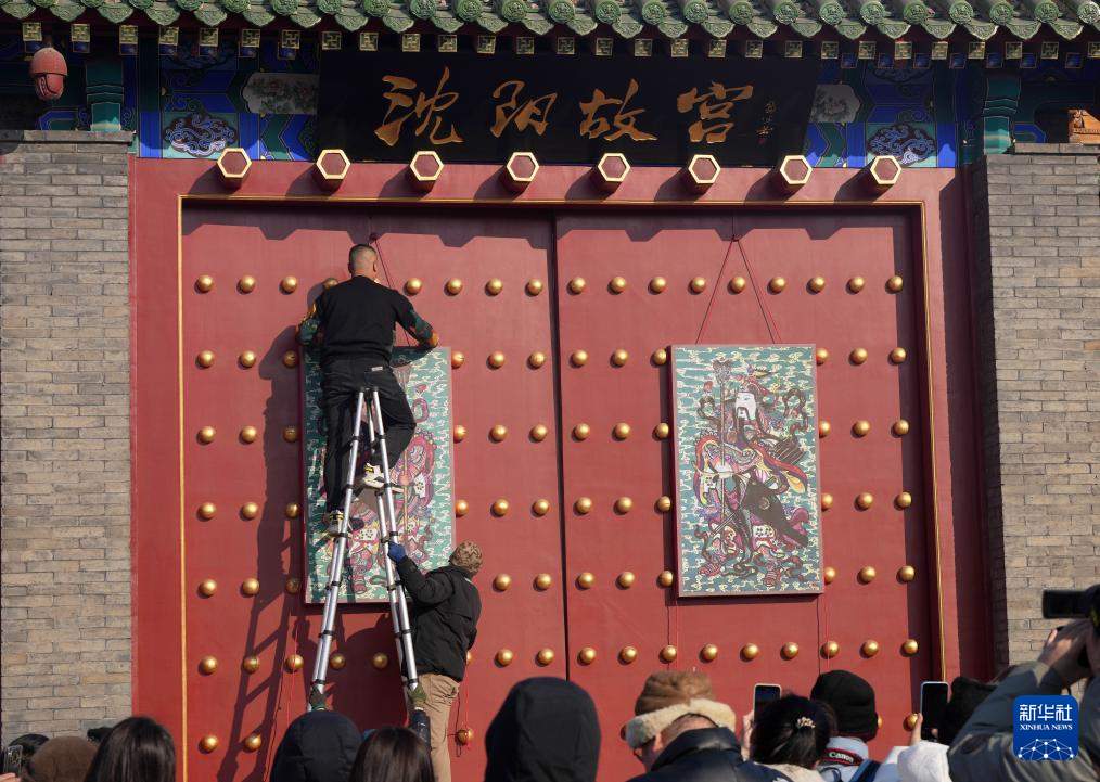 1月22日,“到沈阳故宫过大年”系列文化活动在沈阳启动,这是沈阳故宫工作人员在悬挂门神。