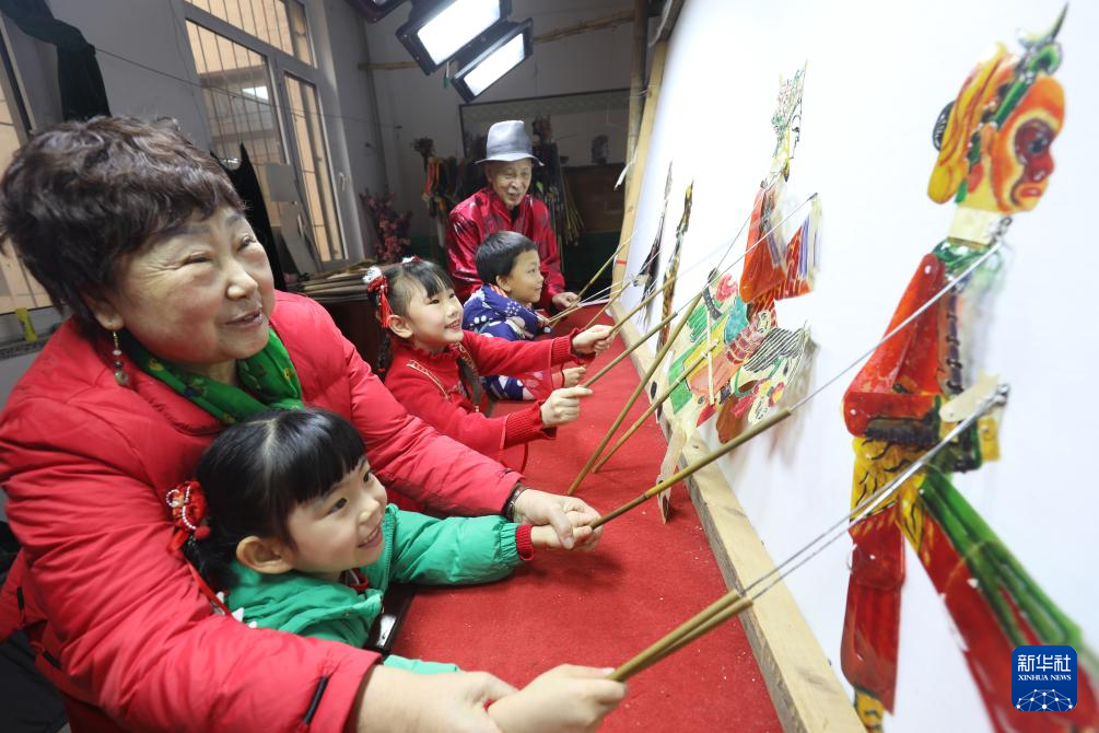 1月21日,在河北省唐山市丰润区文化馆,皮影艺人指导小朋友表演皮影戏。