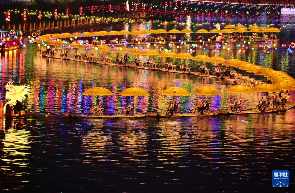 1月21日晚,游客在湖北省宣恩县贡水河中乘坐竹筏赏夜景。