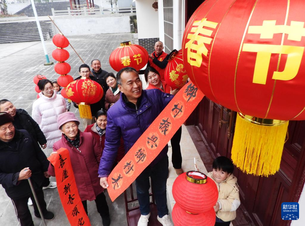 1月22日,在浙江省湖州市长兴县夹浦镇北川村,喜迁新居的村民刘焕永和家人一起挂灯笼。