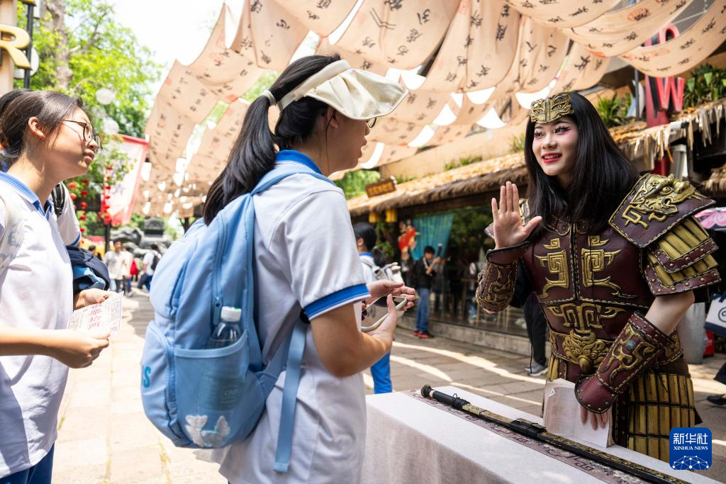 4月28日,在宁乡市炭河古城景区,参与活动的学生(右一)与游客互动。