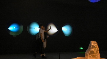 7月4日,在匈牙利佩奇,人们与灯光装置互动。