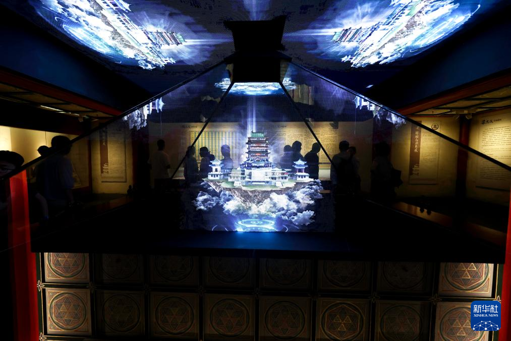 7月7日,游客参观江西南昌滕王阁内的历代滕王阁建筑景观全息数字复原展示。