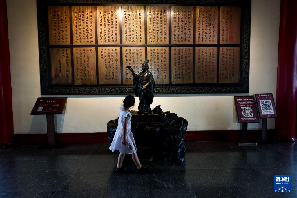 7月7日,一名小朋友在江西南昌滕王阁内的《滕王阁序》铜碑前驻足。