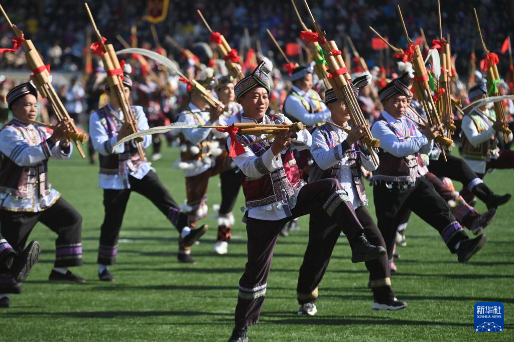 11月29日,表演者在融水县民族体育公园举行的芦笙斗马节开幕式现场表演。