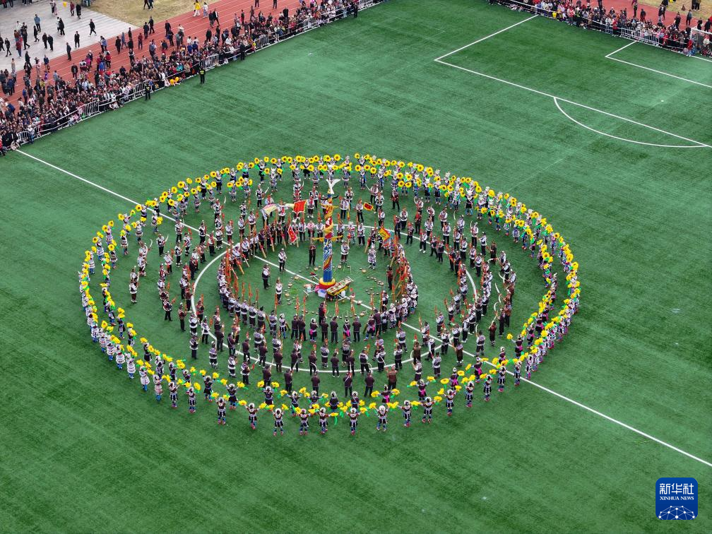 11月29日,表演者在融水县民族体育公园举行的芦笙斗马节开幕式现场表演芦笙踩堂(无人机照片)。