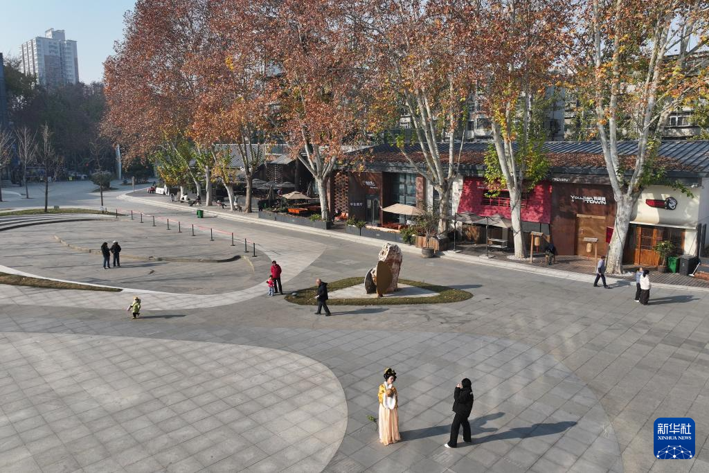 12月4日,游人在西安时光文化公园消费休闲(无人机照片)。这座公园是由西安国营第一钟表机械厂旧厂区改建而来的。