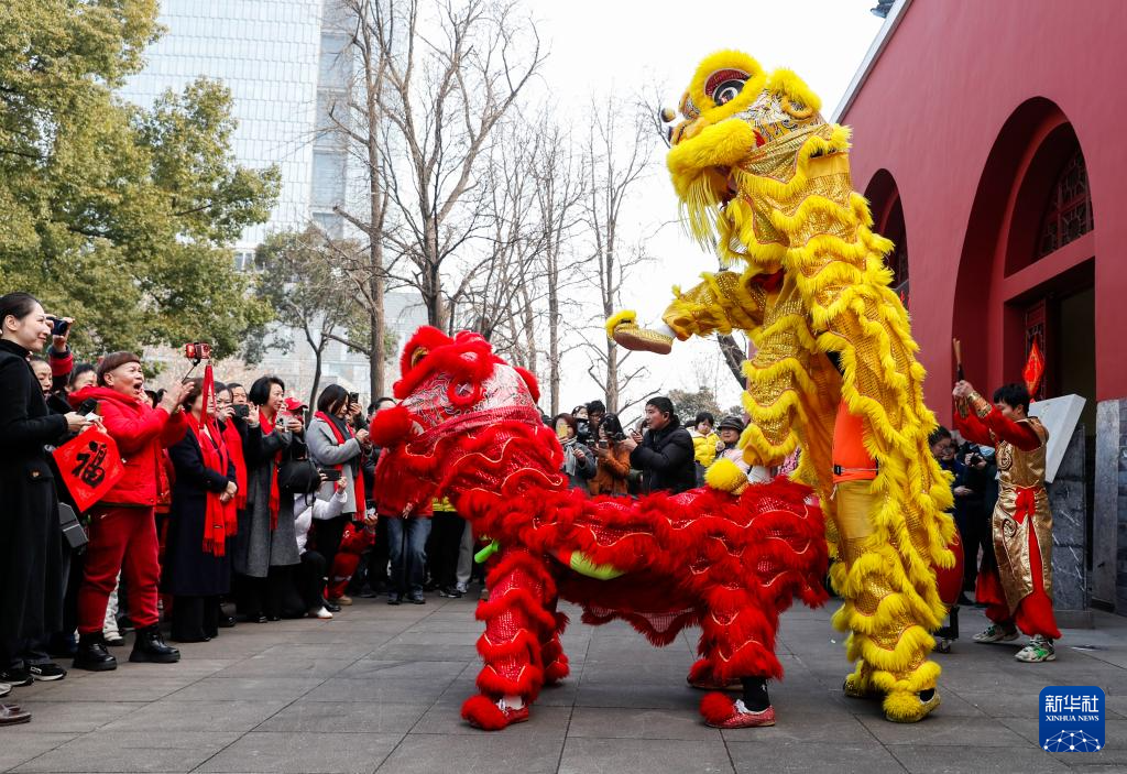 2月4日,在江苏省南京市鼓楼区立春送福活动现场,舞狮队为市民表演。