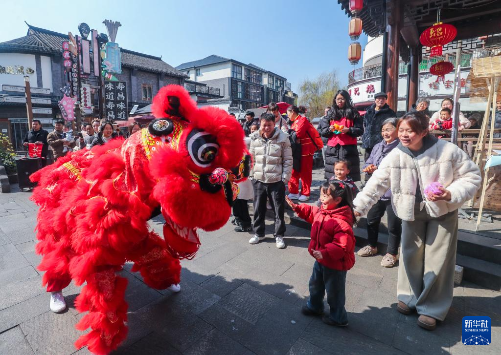 2月8日,在寿昌古镇老街上,舞狮演员跟游客互动。