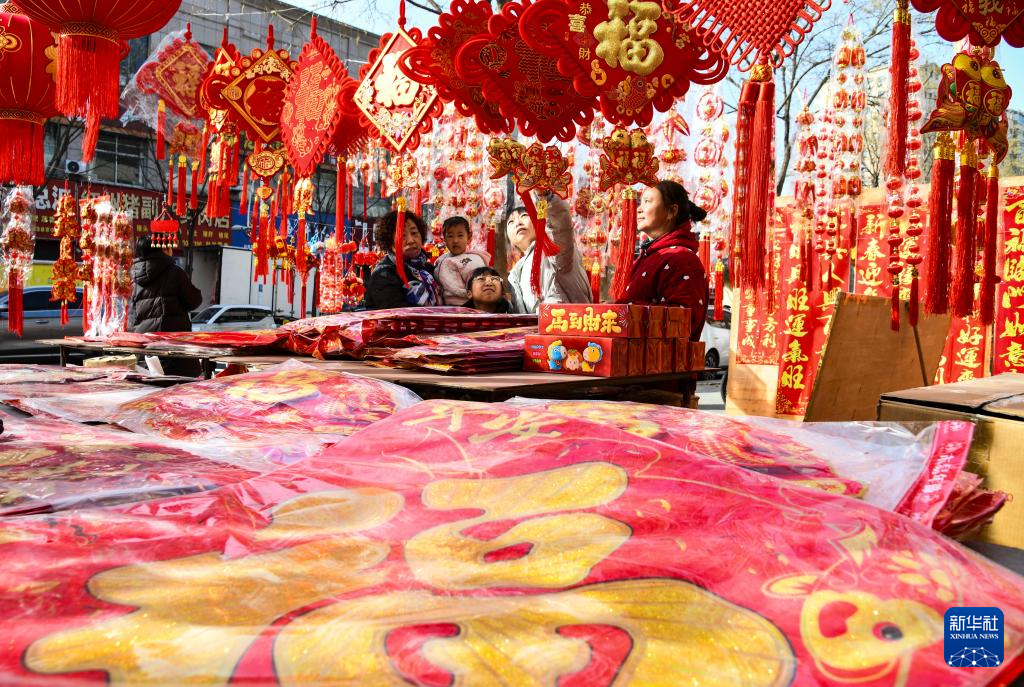 春节将至,各地群众选购节庆饰品和年货,迎接新春佳节的到来。
