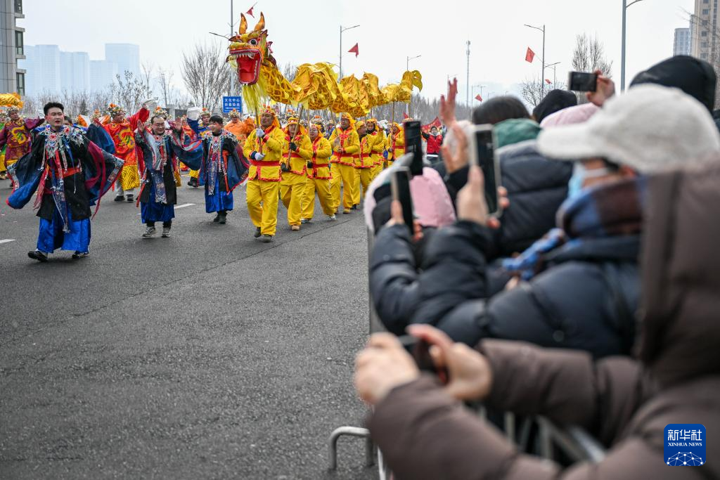 2月26日拍摄的第二届“打起手鼓舞起龙”乌鲁木齐社火巡游展演活动现场。