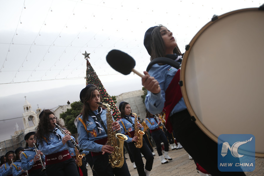 Palestinians perform outside the Church of the Nativity in the West Bank city of Bethlehem on Dec. 24, 2017. Thousands of Christian pilgrims gathered in Bethlehem's Manger Square to celebrate Christmas.(Xinhua Photo)