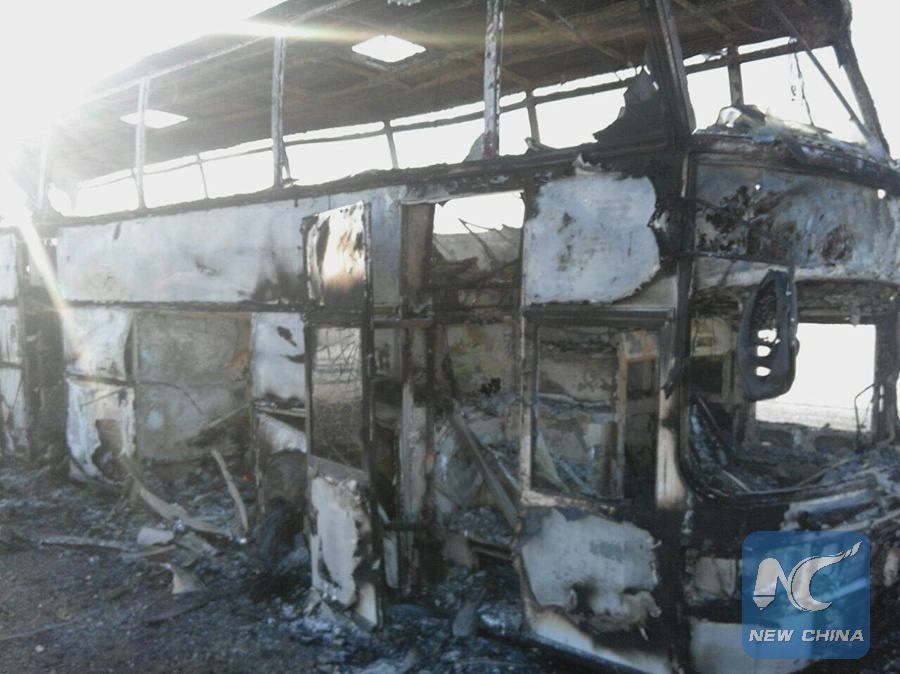 Photo taken on Jan. 18, 2018 shows a burnt bus in northwest Kazakhstan's Aktobe Region. (Xinhua)