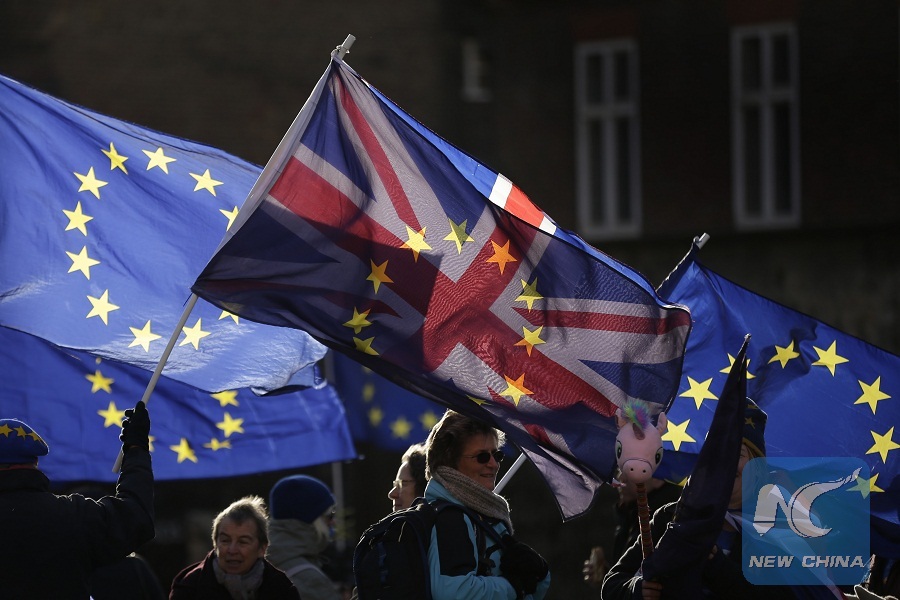 Demonstrators who want Britain to remain in the European Union (EU) wave flags of the EU and Great Britain outside the Houses of Parliament in London, Britain, on Jan. 16, 2018. (Xinhua/Tim Ireland)