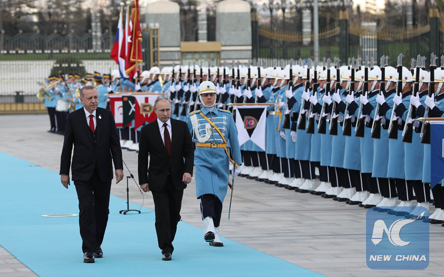 Turkish President Tayyip Erdogan and his Russian counterpart Vladimir Putin review a guard of honour during a welcoming ceremony at the Presidential Palace in Ankara on April 3, 2018. (AFP photo)