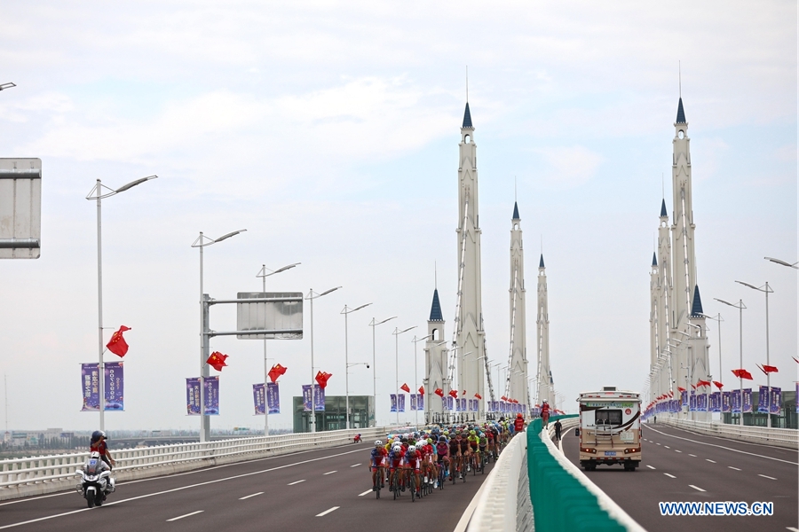 Cyclists compete in the twelfth stage of the Tour of Qinghai Lake in Yinchuan, northwest China's Ningxia Hui Autonomous Region, on August 3, 2018. (Photo by Lu Mi)