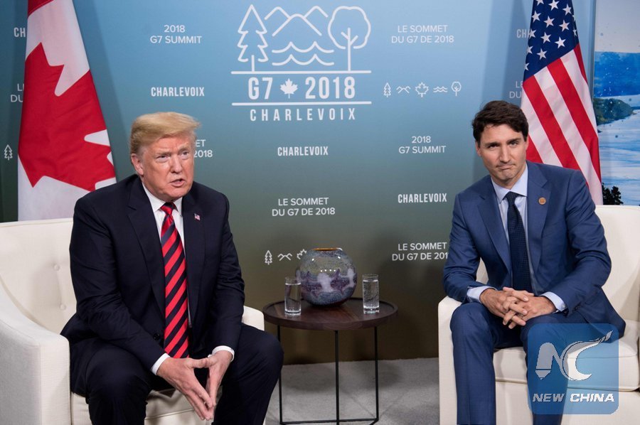File Photo: U.S. President Donald Trump and Canadian Prime Minister Justin Trudeau hold a meeting on the sidelines of the G7 Summit in La Malbaie, Quebec, Canada, June 8, 2018. (Xinhua/AFP)