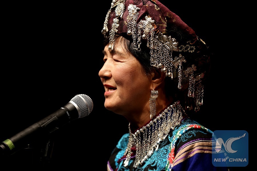 An Artist from China's Yunnan Province sings a traditional song during the opening ceremony of the Exhibition of Intangible Cultural Heritage in Yunnan Province of China and Happy Chinese New Year Photo Exhibition at the China Cultural Center in Yangon, Myanmar, Jan. 29, 2019. (Xinhua/U Aung)