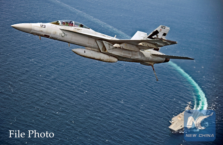 A F/A-18F Super Hornet jet flies over the USS Gerald R. Ford as the U.S. Navy aircraft carrier tests its EMALS magnetic launching system, which replaces the steam catapult, and new AAG arrested landing system in the Atlantic Ocean July 28, 2017. ( U.S. Navy/Erik Hildebrandt/Handout via REUTERS)