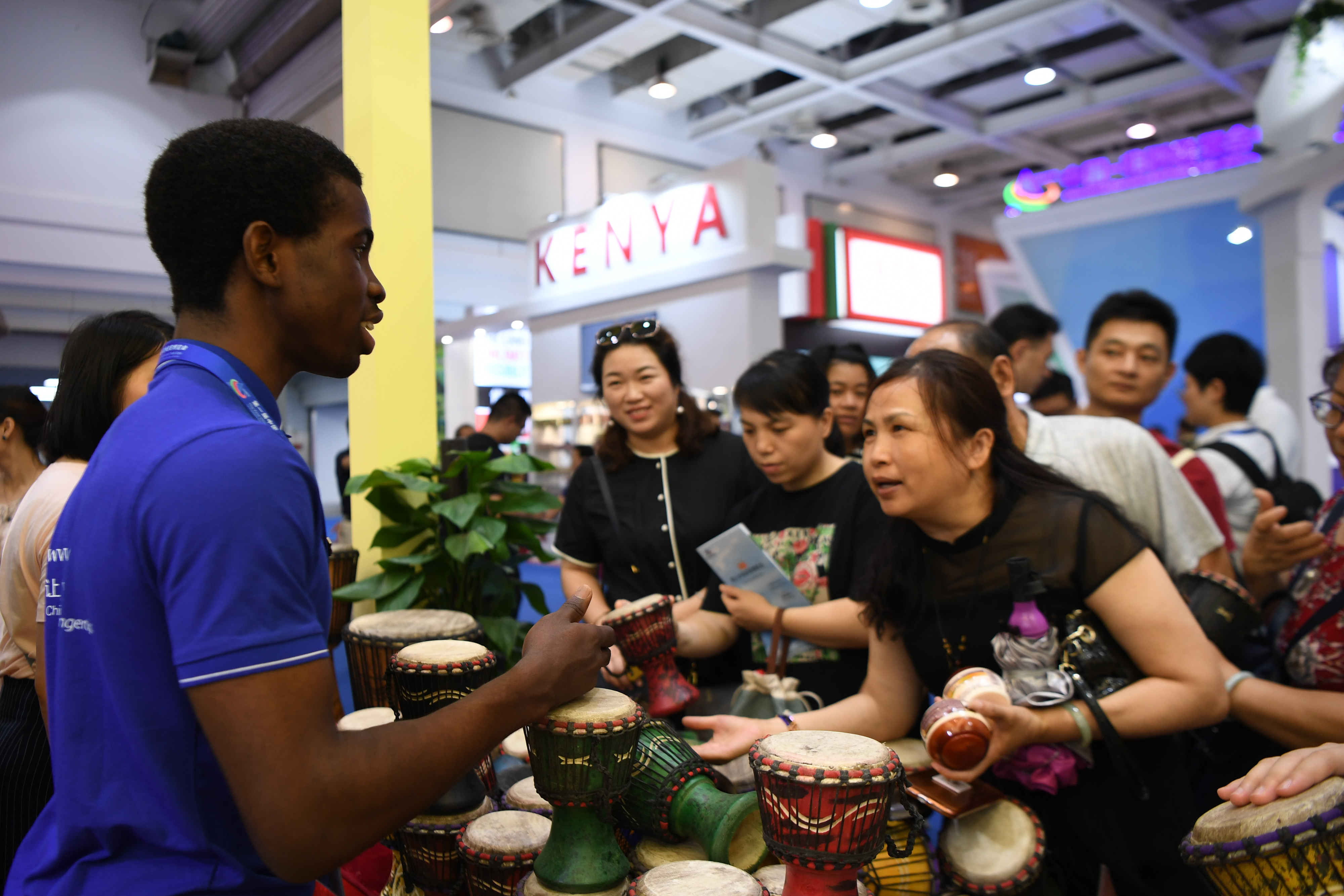 A man from the Republic of Ghana recommends a hand drum to visitors during the China-Africa Economic and Trade Expo in Changsha, central China's Hunan Province, June 28, 2019. (Xinhua/Xue Yuge)