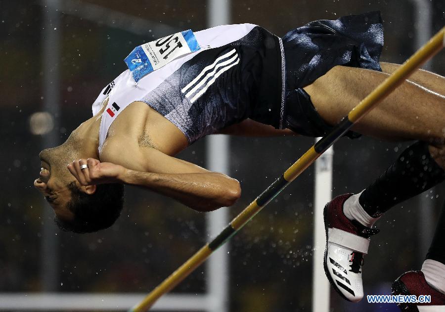 Majed Aldin Gazal of Syria competes during the men's high jump of track and field at the 7th CISM Military World Games in Wuhan, capital of central China's Hubei Province, Oct. 22, 2019. (Xinhua/Wang Lili)